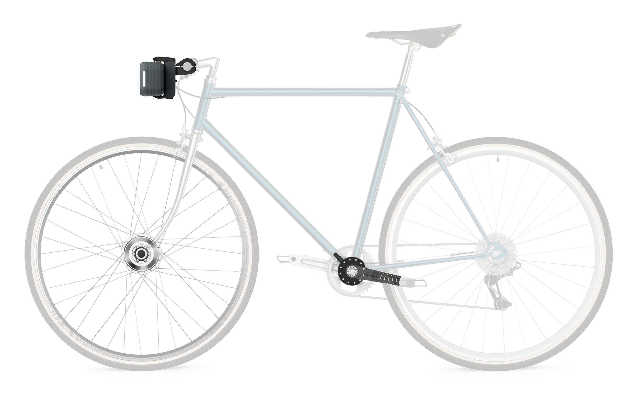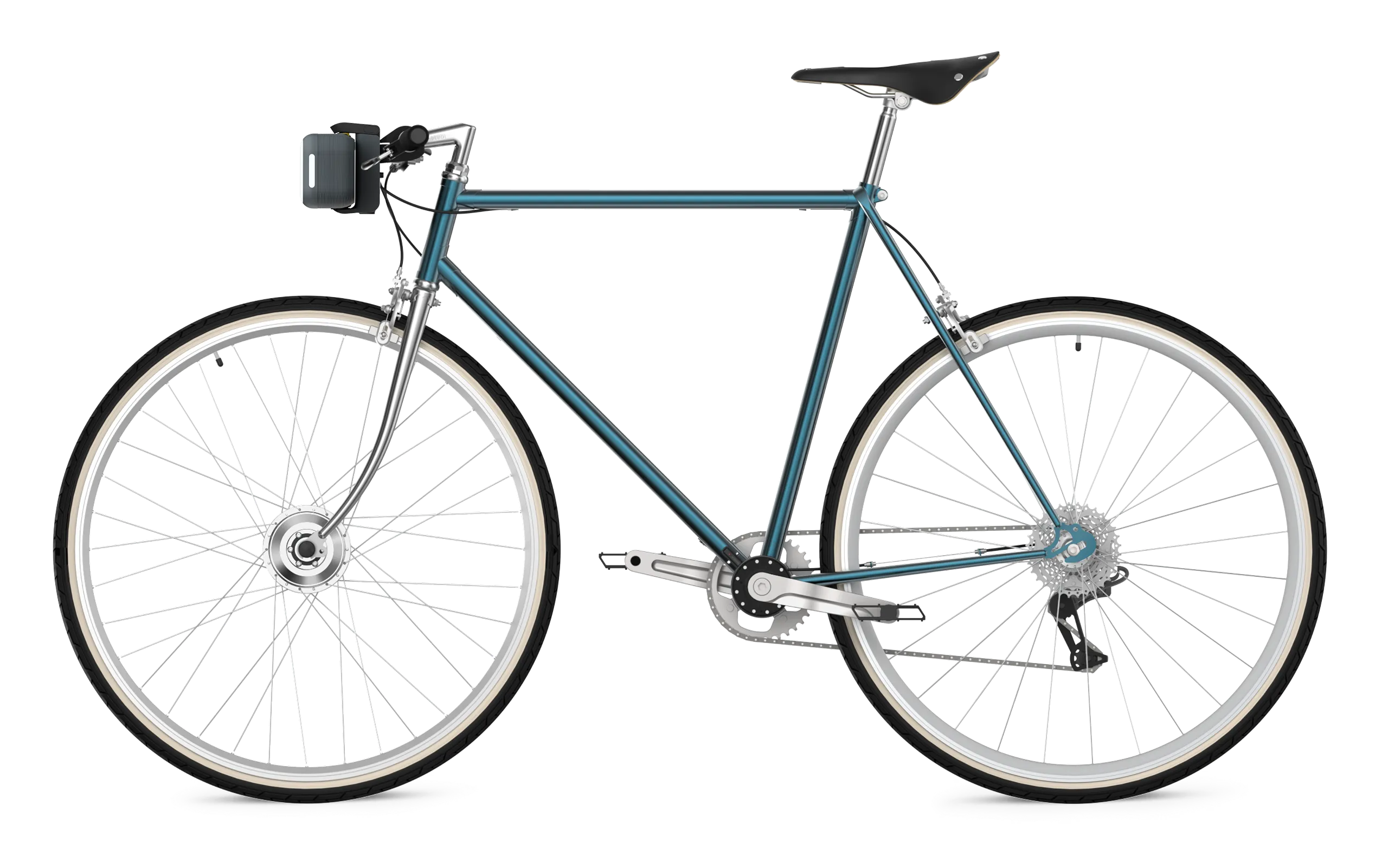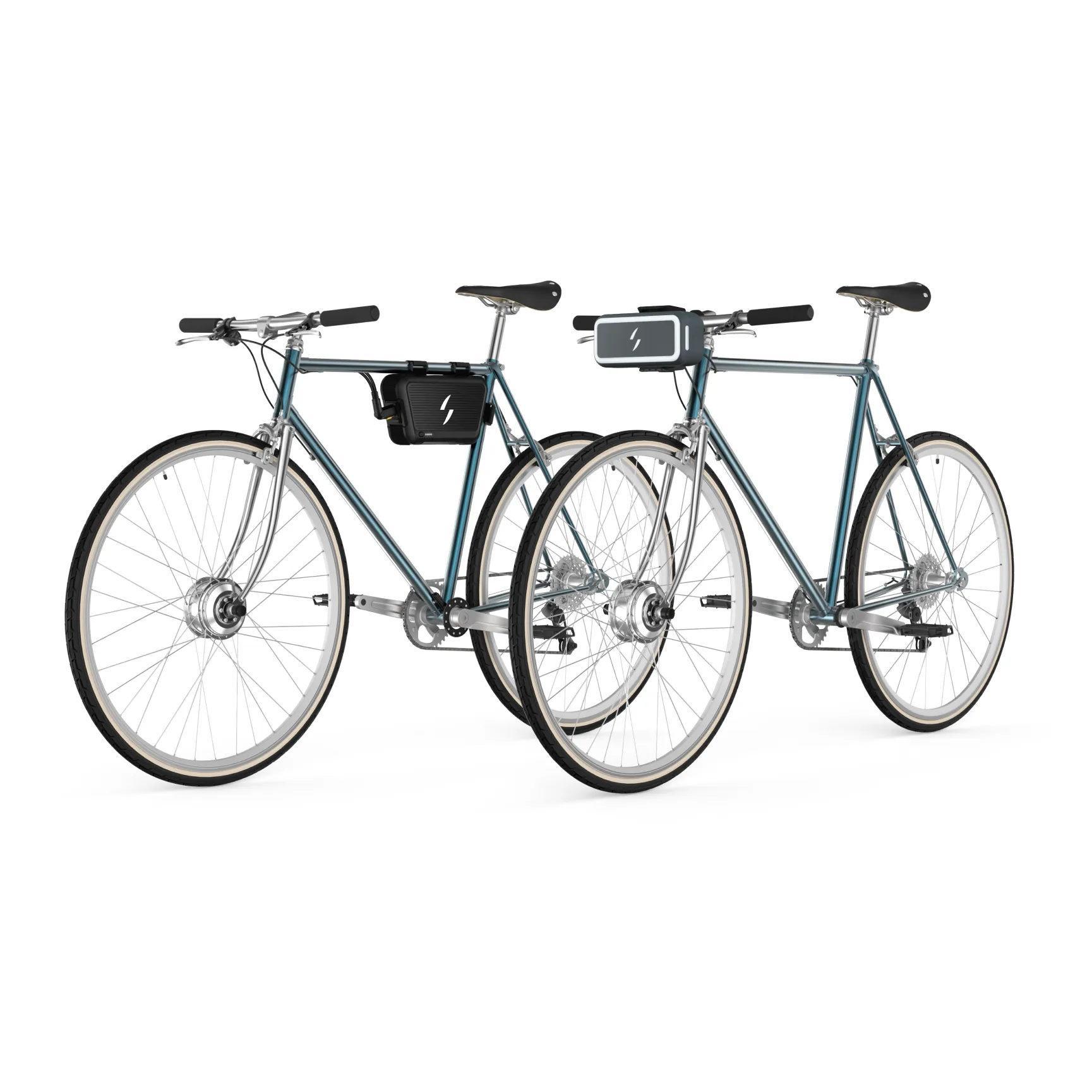 Containing a motor controller, and advanced lithium ion battery with 20-60 miles range. It connects to the front motor wheel and pedal sensor via a single cable harness that plugs in to the side.