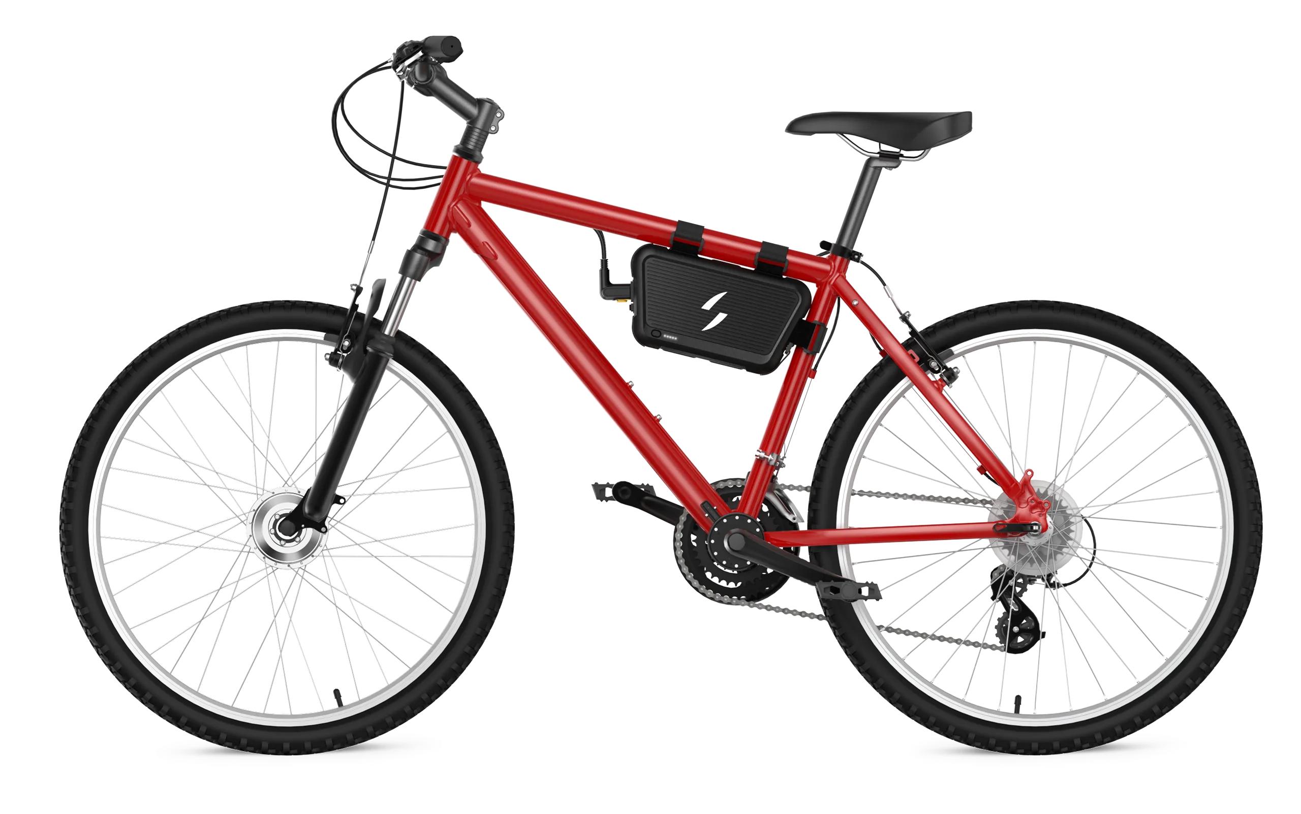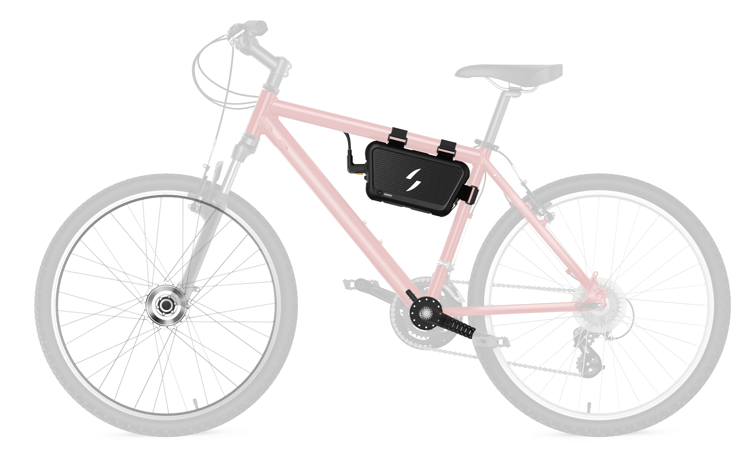 Containing a motor controller, and advanced lithium ion battery with 20-60 miles range. It connects to the front motor wheel and pedal sensor via a single cable harness that plugs in to the side.