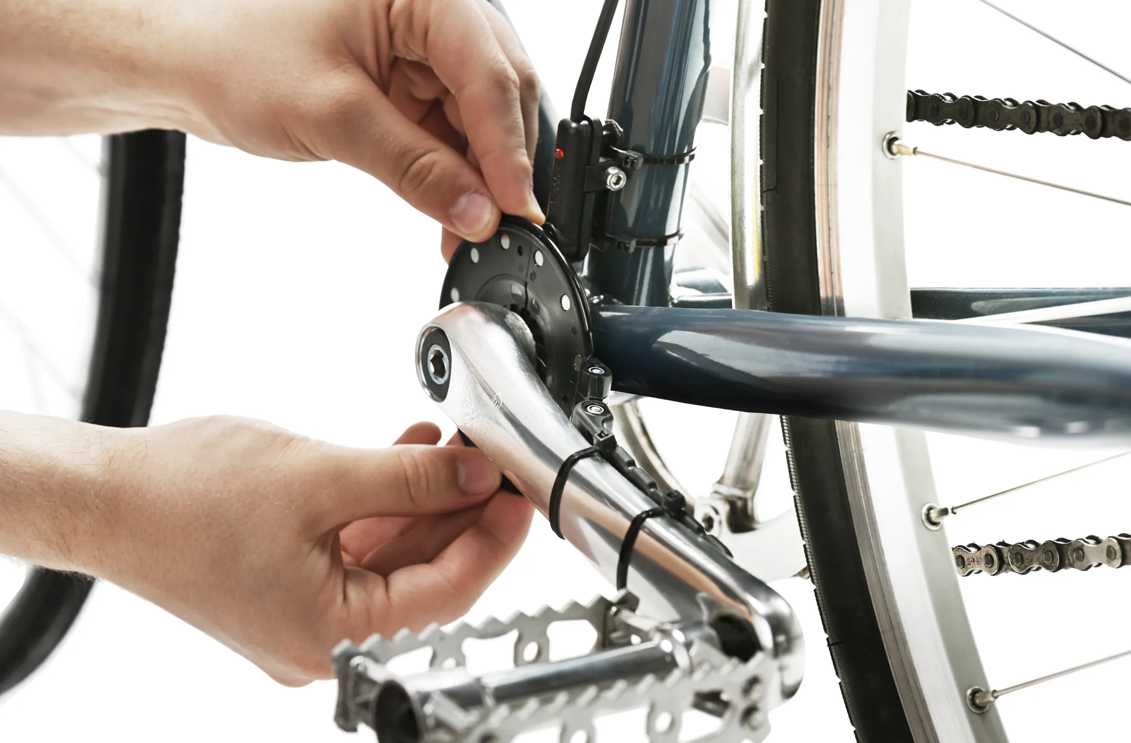 For the standard, universal, or Brompton pedal sensor, all you need is a pair of scissors to trim the cable ties. For the Brompton specific magnetic discs you will need a 2.5mm Allen key – the manual for this is here. For the integrated option, you’ll need a bottom bracket remover to take off the crank arm. This tool is available in our shop as part of our toolkit.